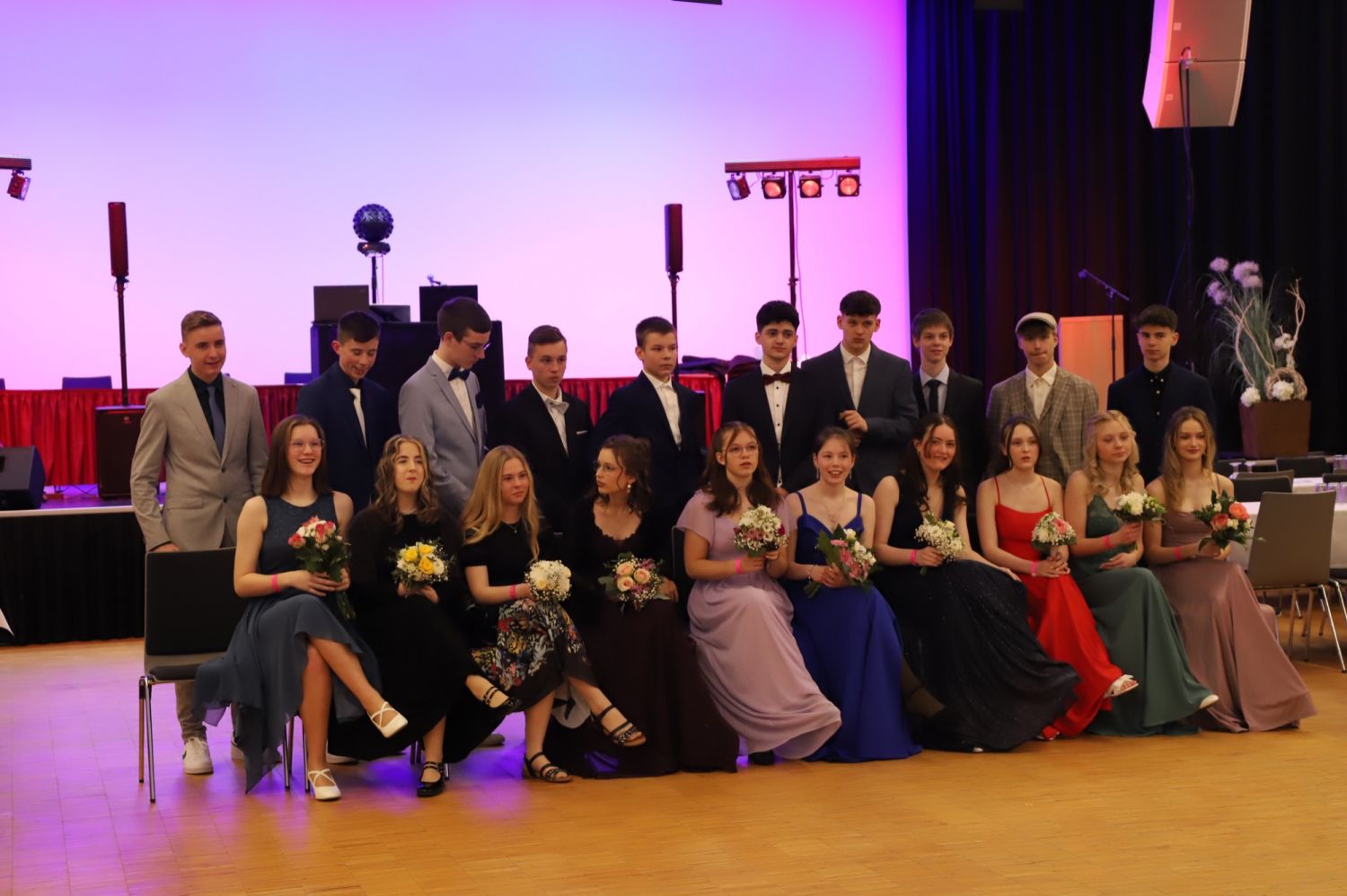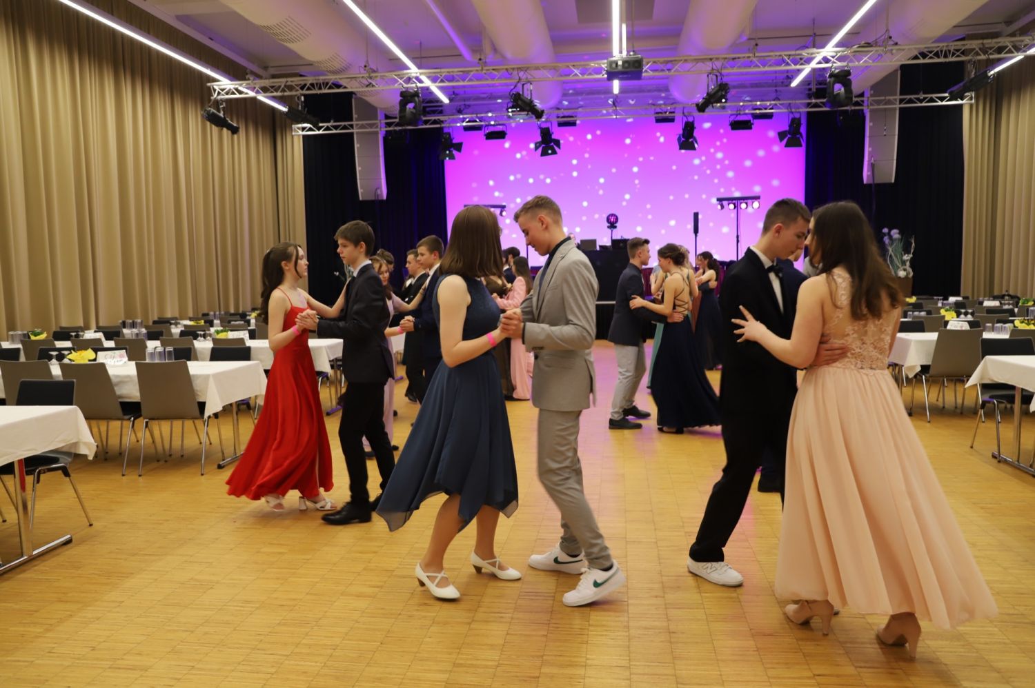 Tanzstundenabschlussball der 9. Klassen der Emil-Petri-Schule Die Schülerinnen und Schüler der neunten Klassen der Emil-Petri-Schule haben am 09.03.2024 erfolgreich ihren Tanzstundenabschlussball gemeistert. Unter Leitung der Tanzschule Leichtfüßig lernten die SchülerInnen über mehrere Monate hinweg nicht nur Tänze wie ChaChaCha oder Disco Fox, sondern auch Wiener Walzer oder Foxtrott. Als dann endlich der große Abend gekommen war, durften die Jugendlichen nach wochenlangem Training endlich ihr Können unter Beweis stellen. Obwohl der Einlass offiziell erst ab 19 Uhr begann, sollten sich die Tanzschüler schon um 17.30 Uhr in der Mehrzweckhalle Neue Mitte in Ichtershausen versammeln. Denn nichts sollte an diesem großen Abend schief gehen. So wurden alle Tänze nochmals geprobt und natürlich wurden viele Erinnerungsfotos geschossen. Als dann endlich die Gäste eintrafen, war den Tänzern die Nervosität anzusehen. Es lag eine deutliche Anspannung in der Luft. Gegen 20 Uhr starte dann das Programm mit dem feierlichen Einmarsch der Jugendlichen. Eröffnungstanz war der traditionelle Wiener Walzer, auf diesen folgte ein Blues. Anschließend durften alle Schülerinnen und Schüler ihren Eltern begrüßen und die ersten Lobesworte abholen. Eine weitere Herausforderung bildete die Aufgabe, jemanden zum Tanzen aufzufordern, mit dem man nicht verwandt ist. Nach einigen freien Tanzrunden folgte der Foxtrott und ein etwas schnellerer Jive. Dieser sah zwar für die Zuschauer leicht aus, jedoch fiel es den Jugendlichen nicht immer leicht, sich dem Takt anzupassen. Dennoch wurde auch diese Aufgabe mit Bravour gemeistert. Doch nicht nur die Jugendlichen durften ihr Können unter Beweis stellen, auch die Eltern wurden in das tolle Programm eingebunden und konnten das Tanzbein schwingen. Der Vater-Tochter- bzw. Mutter-Sohn-Tanz bildete einen gelungenen Abschluss. Und obwohl bei den Eltern nicht jeder Schritt saß, hatten alle Beteiligten beim Langsamen Walzer ein Lächeln im Gesicht. Nach diesen Pflichtrunden war den TanzschülerInnen die Erleichterung deutlich anzusehen. Nun konnten alle den weiteren Abend mit Discofox und Gruppentänzen wir Macarena und Sirtaki genießen.Sowohl für die Jugendlichen als auch für ihre Gäste, bestehend aus Eltern, Freunden und Lehrern, war der Tanzstundenabschlussball ein gelungener Abend, den sie immer in Erinnerung behalten werden. Fotos: Heike Aumann