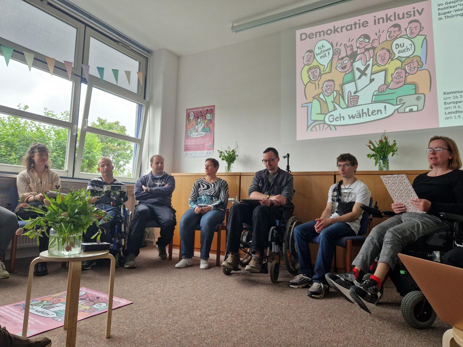Das Team aus Beschäftigten der Werkstatt, Arbeit und Leben Thüringen und dem Verein „Inklusive Werkstatt für Kultur und Geschichte e.V.“ hat sich zum Ziel gesetzt, Informationen zur Wahl in einfacher Sprache zu recherchieren und anderen Menschen bereitzustellen. Denn sowohl den Ablauf von Wahlen als auch den Inhalt von Wahlprogrammen verständlich für Menschen mit Behinderung abzubilden – das gab es vorher in Thüringen noch nicht.