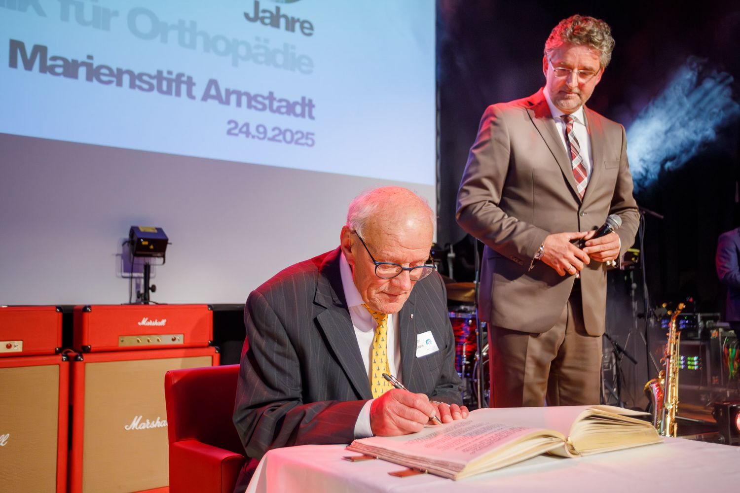 Einer, der ganz besonders in den Nachwendejahren prägend für das Marienstift war, ist Kirchenrat Jürgen Friedrich. In seine Zeit fallen zahlreiche Neubauten wie auch inhaltliche Erweiterungen im Leistungsspektrum der Marienstift-Einrichtungen. Als „Baumeister des Marienstifts“ wurde ihm im Rahmen der Jubiläumsfeier die große Ehre zuteil, sich ins Goldene Buch der Stadt Arnstadt einzutragen. „Jürgen Friedrich hat das Marienstift gestaltet und bleibende Spuren in Arnstadt hinterlassen“, sagte Bürgermeister Frank Spilling in seinem Grußwort. „Mit dem Eintrag ins Goldene Buch würdigen wir seine Lebensleistung nicht nur für das Marienstift, sondern auch für Arnstadt.“ Die Mitarbeiterinnen und Mitarbeiter spendeten dem langjährigen Direktor (1991 bis 2009) in diesem emotionalen Moment starken Applaus.
