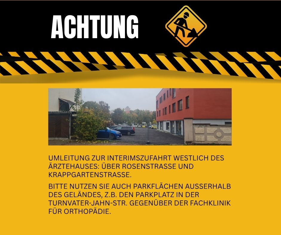 Wir haben eine provisorische Einfahrt in der Krappgartenstraße westlich des Ärztehauses eingerichtet. Diese erreichen Sie über die Rosenstraße und Krappgartenstraße.