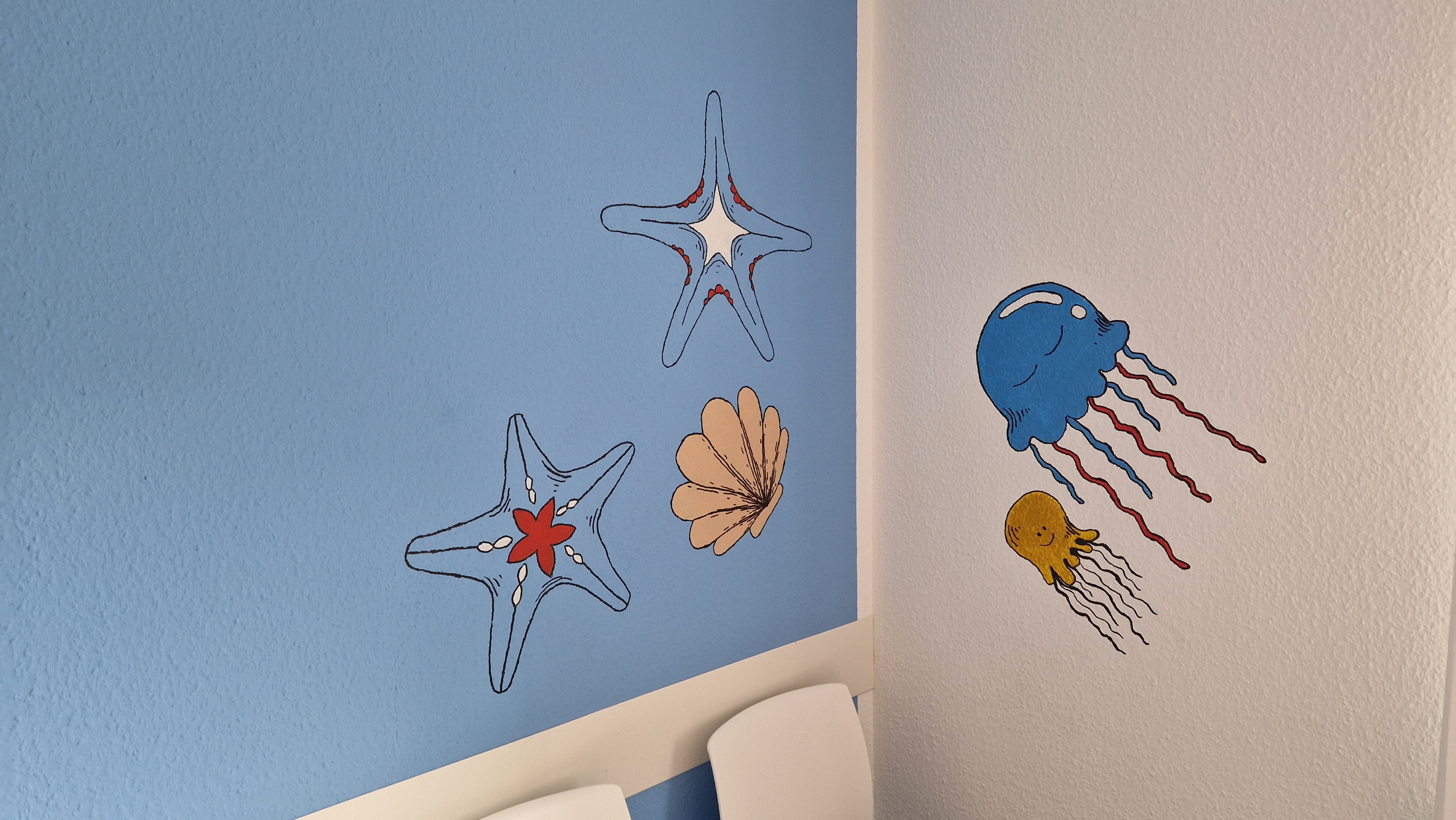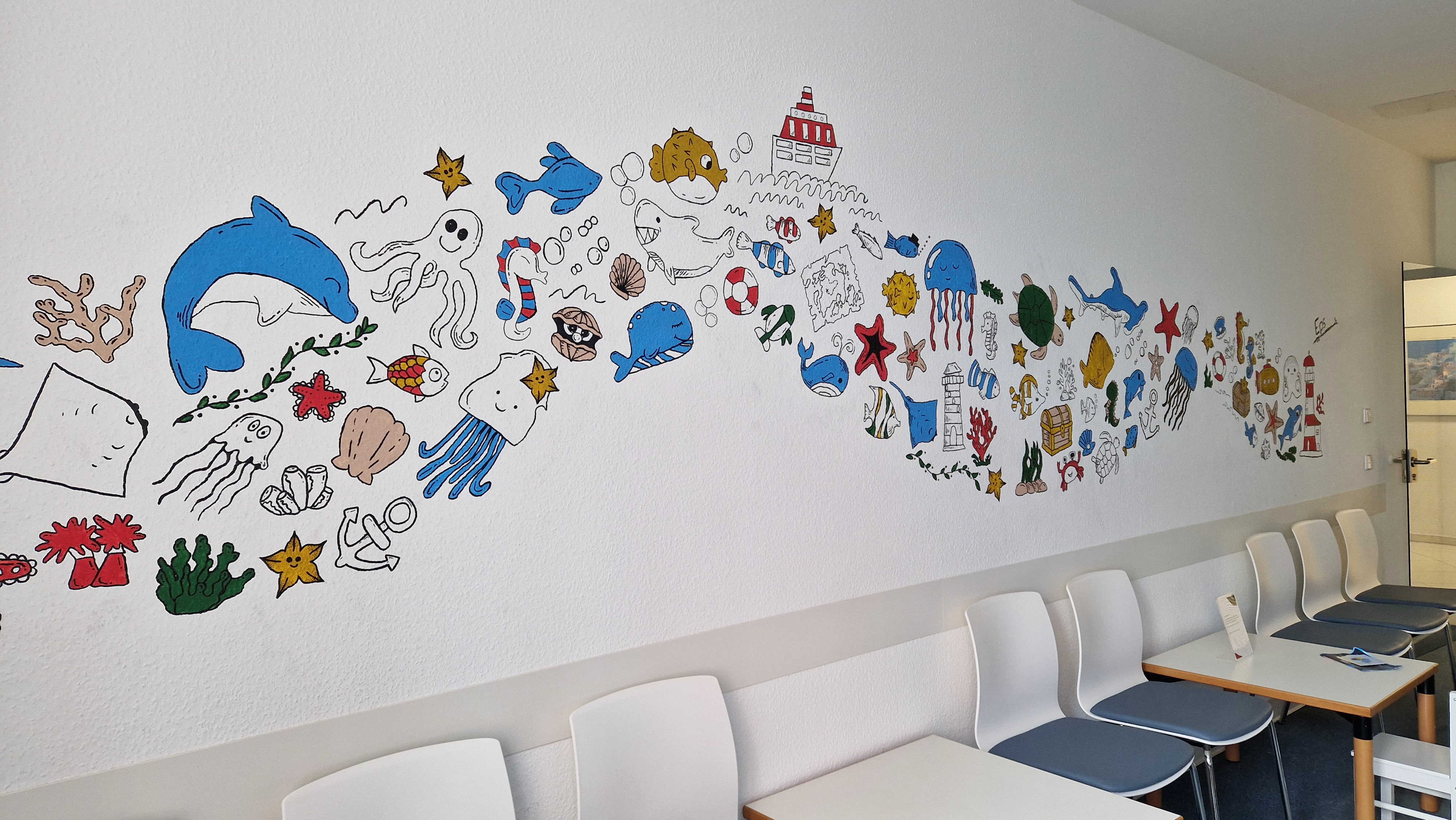 Ein Rätsel für die kleinen Betrachter haben unsere Schülerinnen und Schüler zwischen all dem Meeresgetier außerdem versteckt. Damit die Wartenden nicht nur zuschauen müssen, brachten die Schülerinnen und Schüler ihre Motive nun als Ausmalbild vorbei.