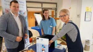 "Wir können nur die Keime eliminieren, die wir gerade auf den Händen haben", ergänzt sie und empfiehlt: Im Foyer, und auf Station und spätestens wieder im Patientenzimmer zu desinfizieren. Außerdem nach dem Toilettengang, vor dem Essen, vor Patientenkontakt und auch wieder beim Verlassen der Klinik die blauen Spender zu nutzen. Zahlreiche Besucher nahmen die Gelegenheit wahr, sich bei Cathleen Richter beraten zu lassen.
