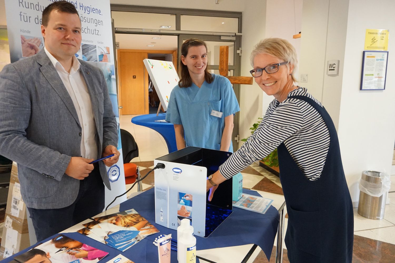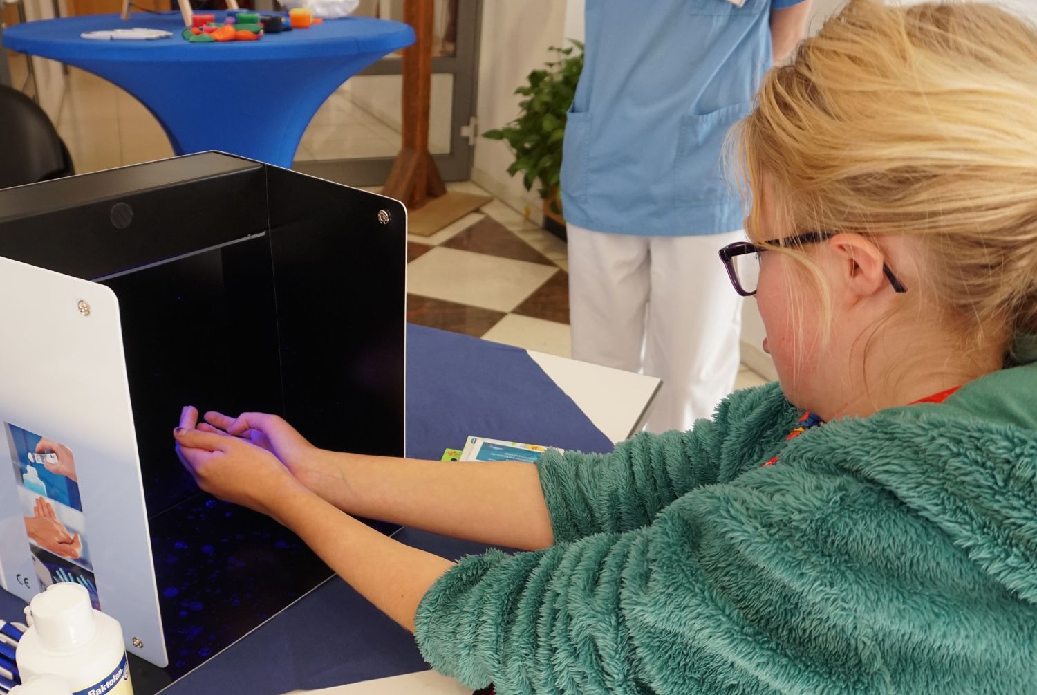 Hygiene-Schwester Cathleen Richter lud heute zum Aktionstag Hygiene ins Foyer der Fachklinik für Orthopädie ein. Patienten und Besucher konnten bei ihr zwischen 10 und 15 Uhr alles über die richtige Handhygiene erfahren. Ausprobieren inklusive: Eine Blackbox zeigte, wo vielleicht noch besser desinfiziert werden kann.