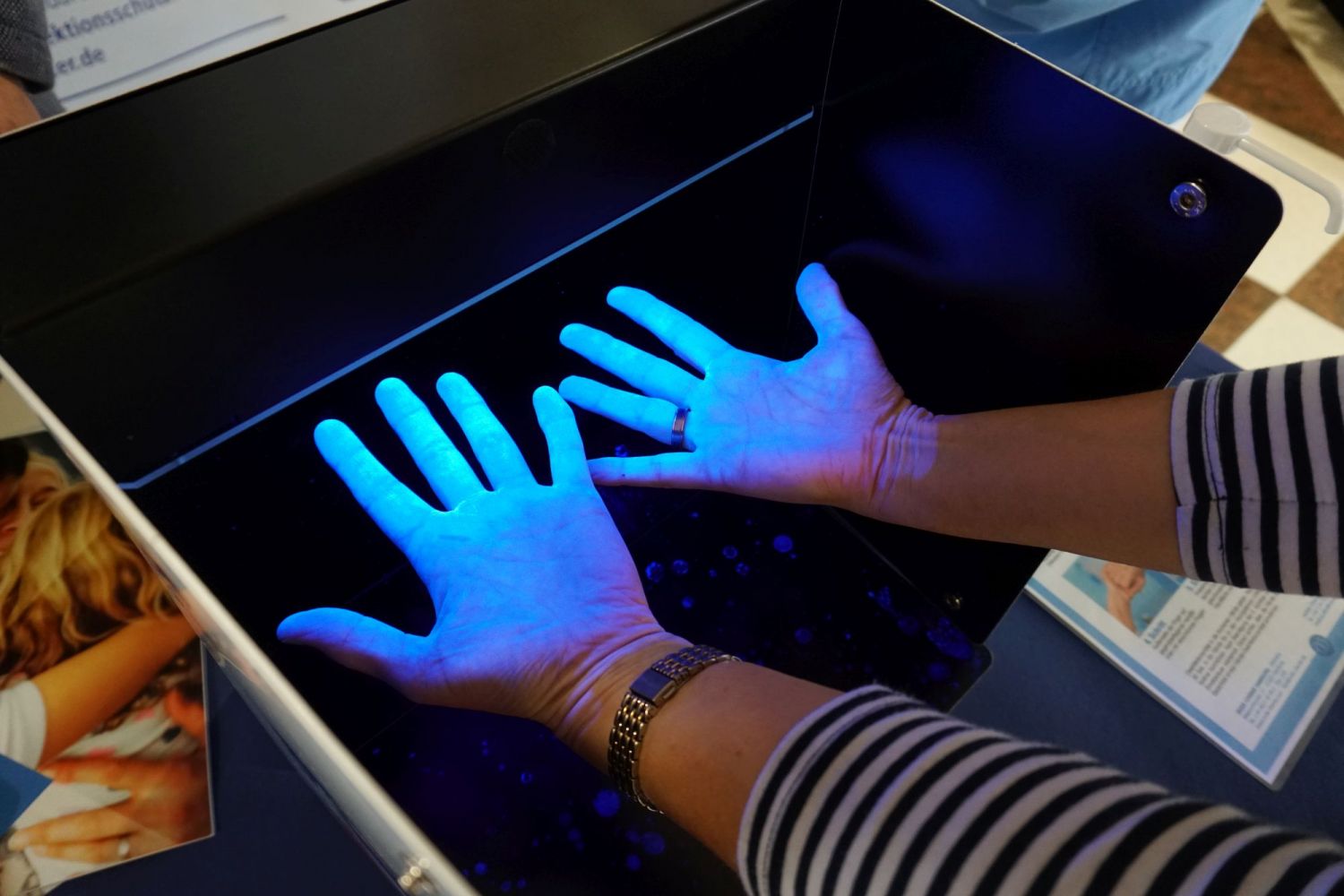 Damit Krankheitserreger draußen bleiben, hängen an den Eingängen, auf den Fluren und Stationen sowie in jedem Patientenzimmer Spender mit Desinfektionsmittel. Ob man dieses richtig benutzt, zeigte am Aktionstag eine Blackbox an: Leuchtete es weiß auf der Haut, war alles gut desinfiziert. Dunklere Stellen deuteten auf Benetzungslücken hin. "Diese befinden sich häufig in der Nagelfalz und den Fingerzwischenräumen", sagt die Hygienefachkraft. "Man sollte zwei Hübe oder eine hohle Handvoll Mittel nehmen und dieses 30 Sekunden lang verreiben - einfach nur an der Luft trocknen zu lassen, genügt nicht."