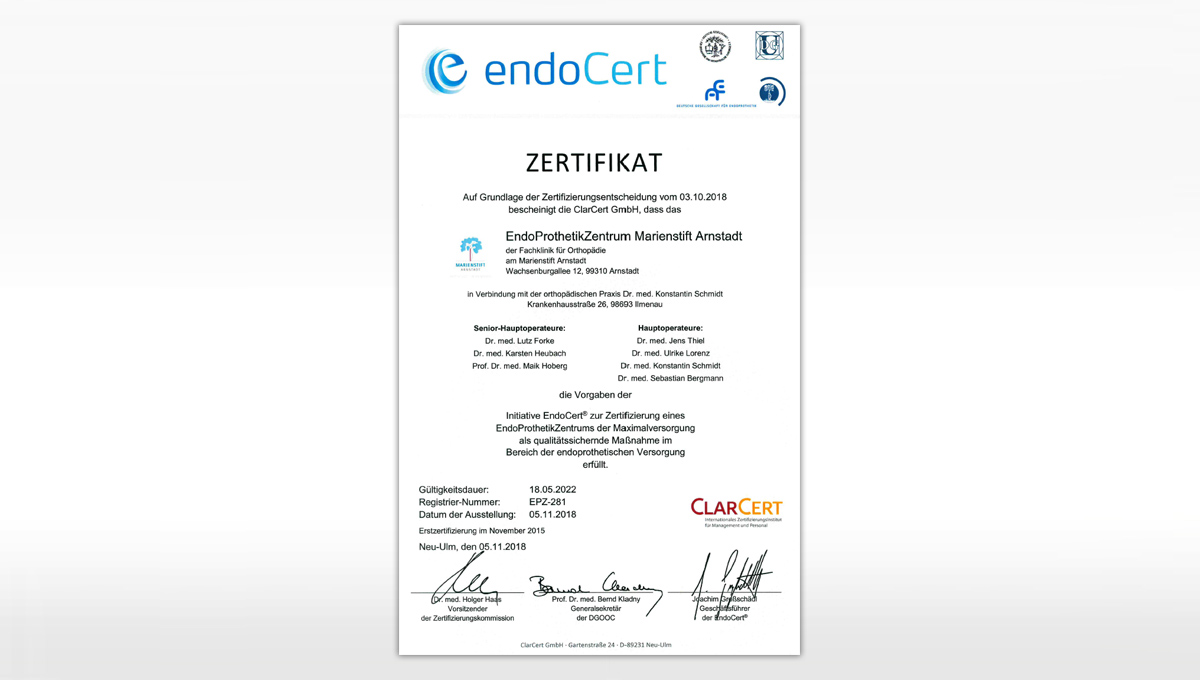 Die Auszeichnung ist eine qualitätssichernde Maßnahme der bundesweit aktiven Initiative EndoCert und gilt als offizieller Beleg dafür, dass im Marienstift Arnstadt endoprothetische Operationen jeden Schwierigkeitsgrades durchgeführt werden können.