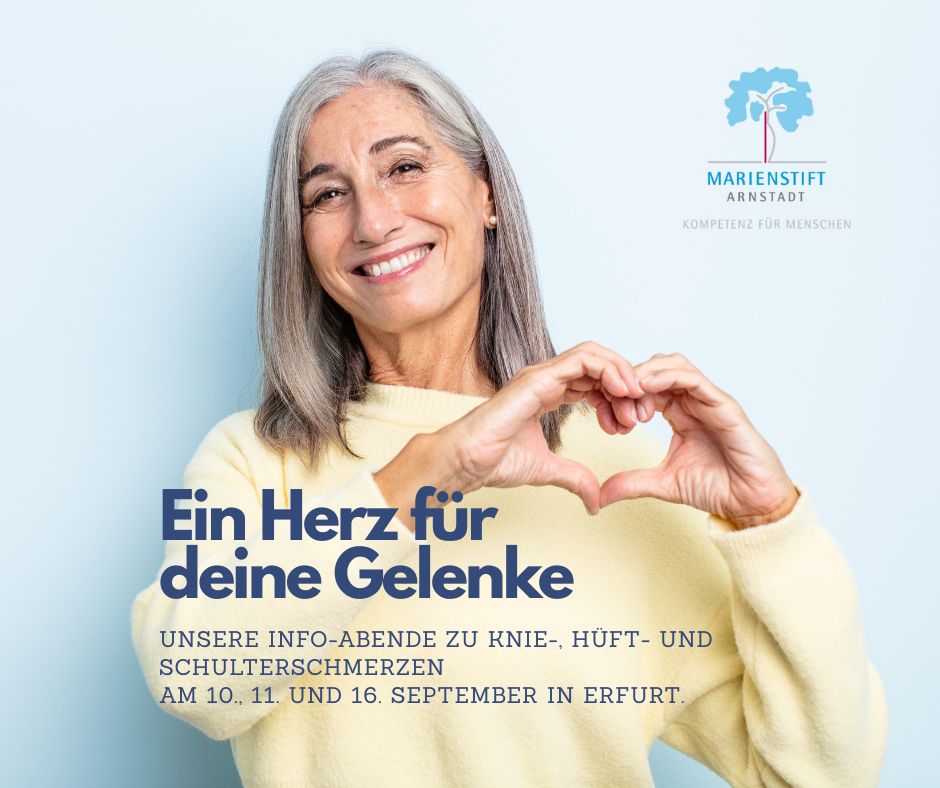 Die Fachklinik für Orthopädie des Marienstifts Arnstadt lädt Interessierte herzlich zu Info-Abenden rund um die Gelenkgesundheit ein und bietet die Gelegenheit, mit unseren Spezialisten ins Gespräch zu kommen über Ursachen, Diagnose und Therapie bei Knieschmerz, Hüftschmerz und Schulterschmerze.