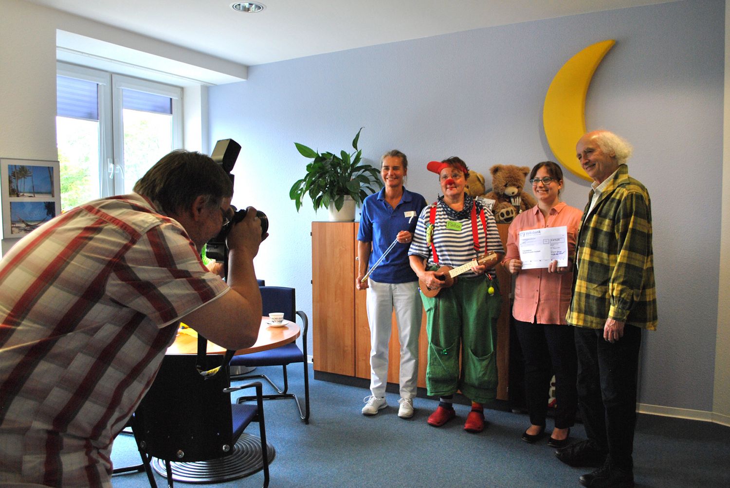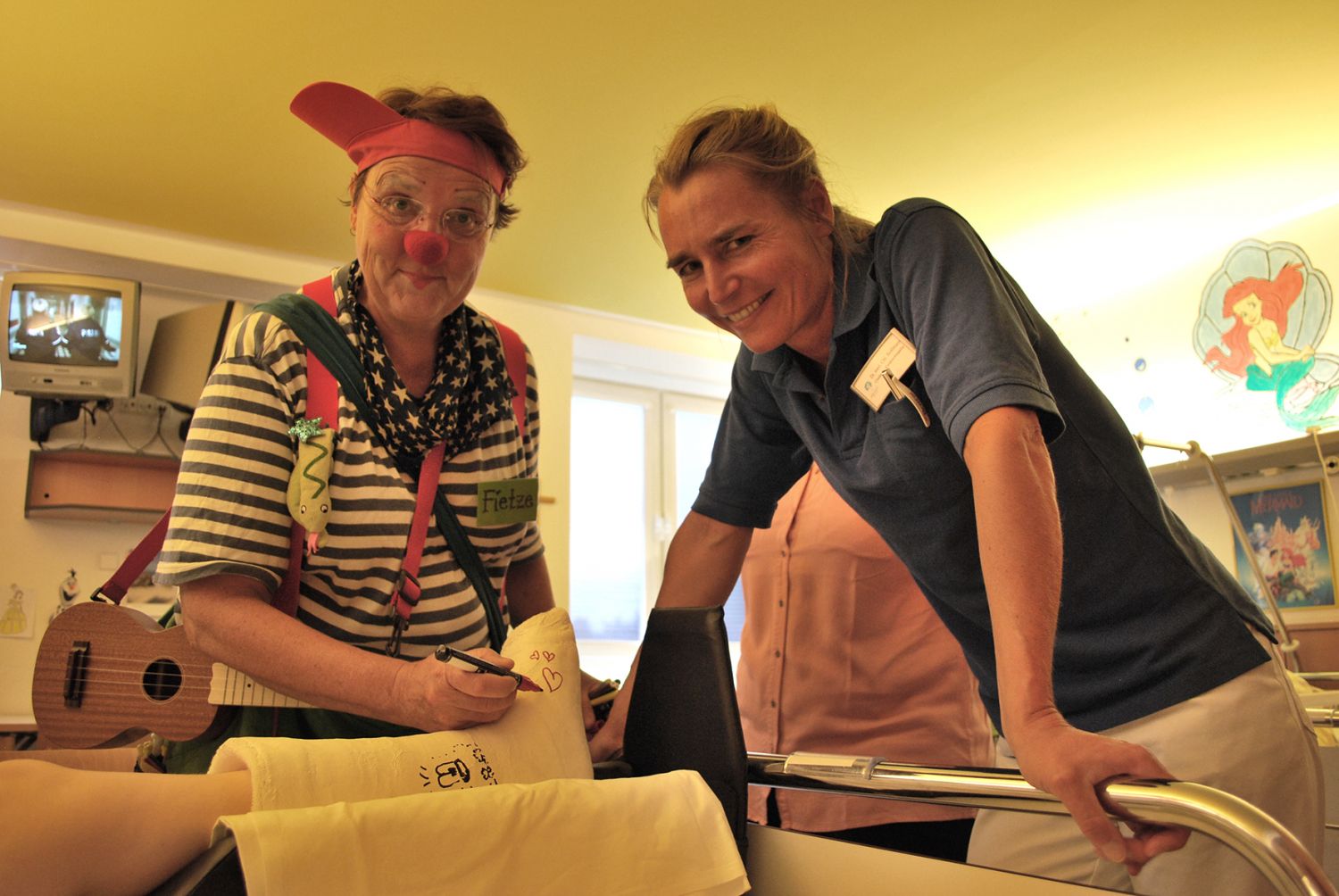 Damit möchte der Verein, der mit seinem Engagement die jungen Patienten der Klinik für Kinderorthopädie unterstützt, die Medi-Stift-Clowns finanzieren. Diese schauen jeden Freitag auf Station 4 (Klinik für Kinderorthopädie) vorbei und zaubern den Kindern ein Lächeln ins Gesicht. Ganz nach dem Motto „Humor hilft heilen“ ist der Besuch der Medi-Clowns zum festen Termin geworden. Beim Pressetermin sang Clown Fietze vor Freude ein Lied, bevor sie anschließend mit Chefärztin Dr. med. Christine Bollmann über die Station ging.