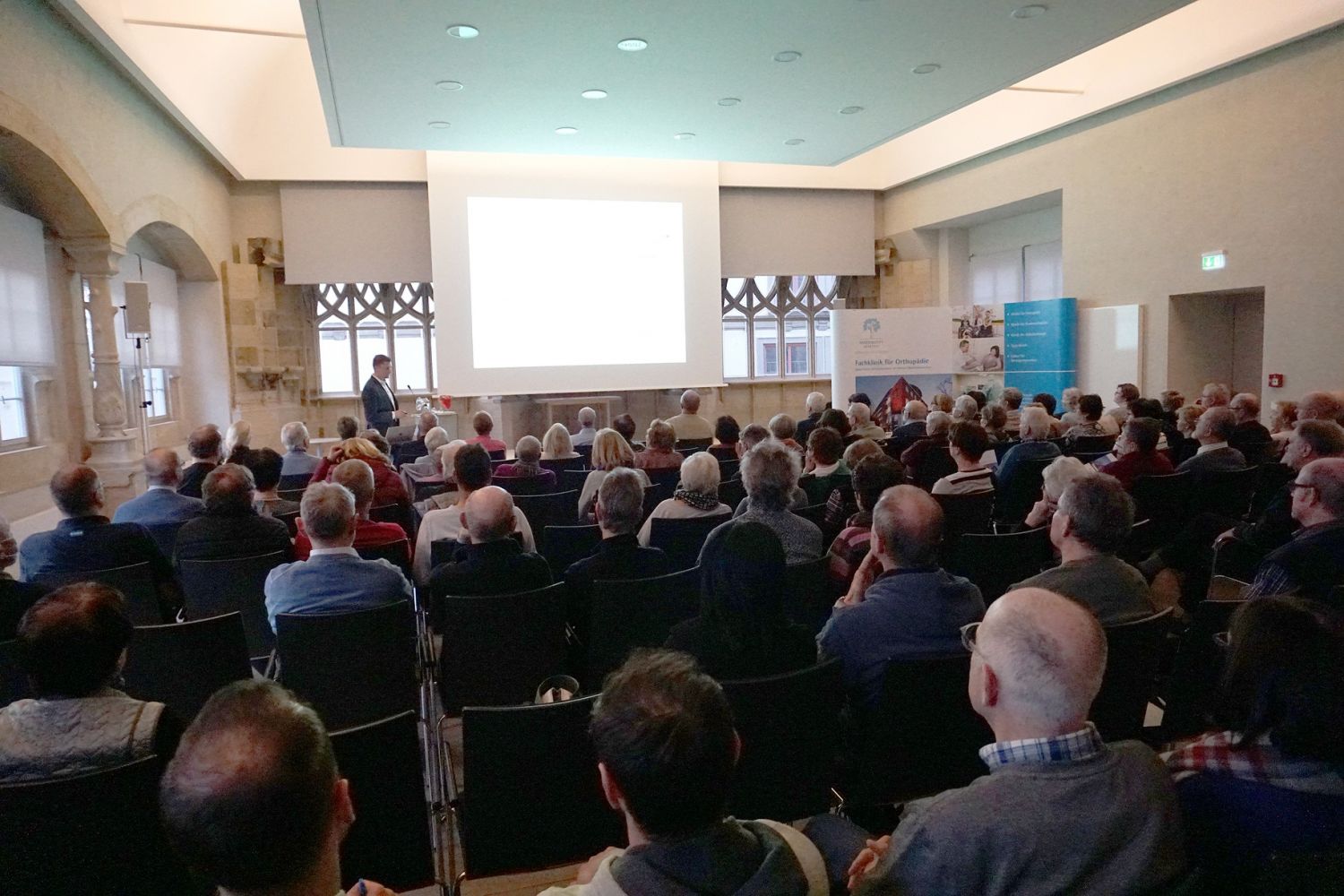 Ein stark nachgefragtes Thema: Im voll besetzten Großen Saal der Alten Universität gewannen die Besucher in zwei Vorträgen nicht nur faszinierende Rückblicke in die Anfänge der Arthroskopie und Endoprothetik, sondern erfuhren viel Wissenswertes zu heutigen, hochmodernen Behandlungsstandards. Beschwerdemuster, Diagnose und Therapiemöglichkeiten kamen dabei ebenso anschaulich zur Sprache. Im Anschluss standen die Referenten, Oberarzt Marco Greis und Oberarzt Dr. med. Karsten Heubach, und das Team der Fachklinik für Fragen der Besucher zur Verfügung.