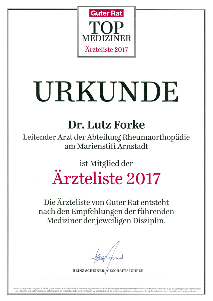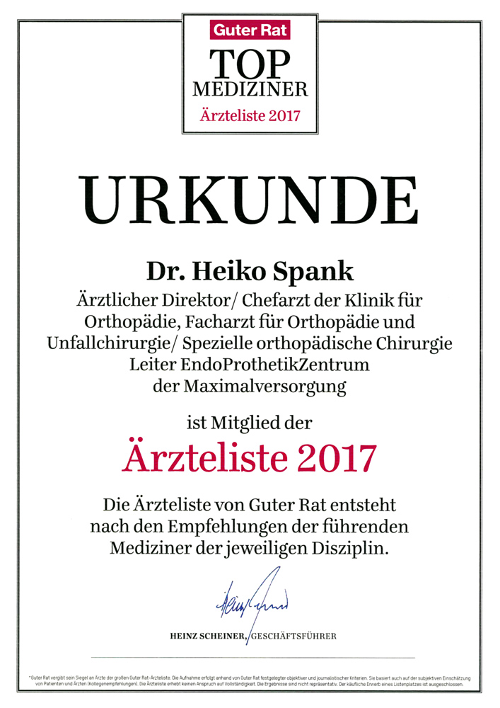 Zum wiederholten Mal sind Dr. med. Heiko Spank, Ärztlicher Direktor der Fachklinik für Orthopädie im Marienstift Arnstadt und Chefarzt der Klinik für Orthopädie, sowie der Leitende Oberarzt Dr. med. Lutz Forke im Kreis der besten Ärzte Deutschlands gelistet.