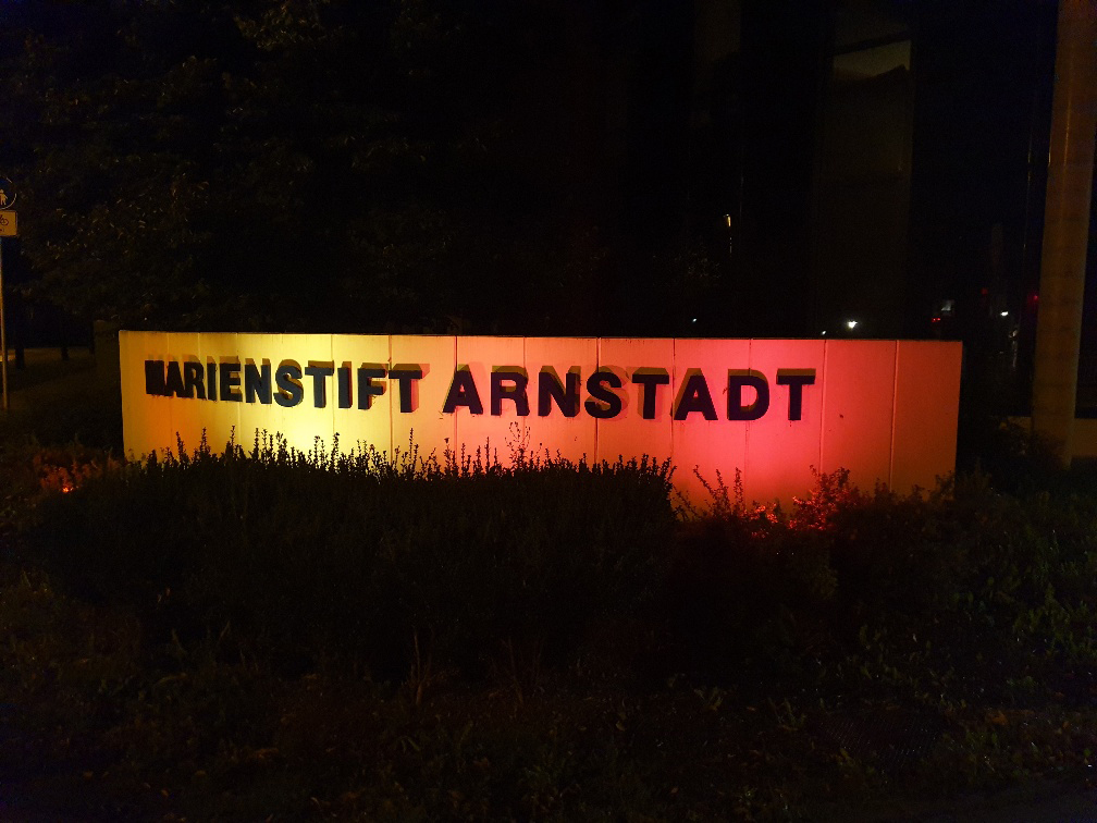 Gut sichtbar: Unsere Klinikfront leuchtet in Orange, der Symbolfarbe der Patientensicherheit, mit der das Marienstift die weltweite Beleuchtungsaktion der WHO schon die ganze Woche optisch unterstützt.
