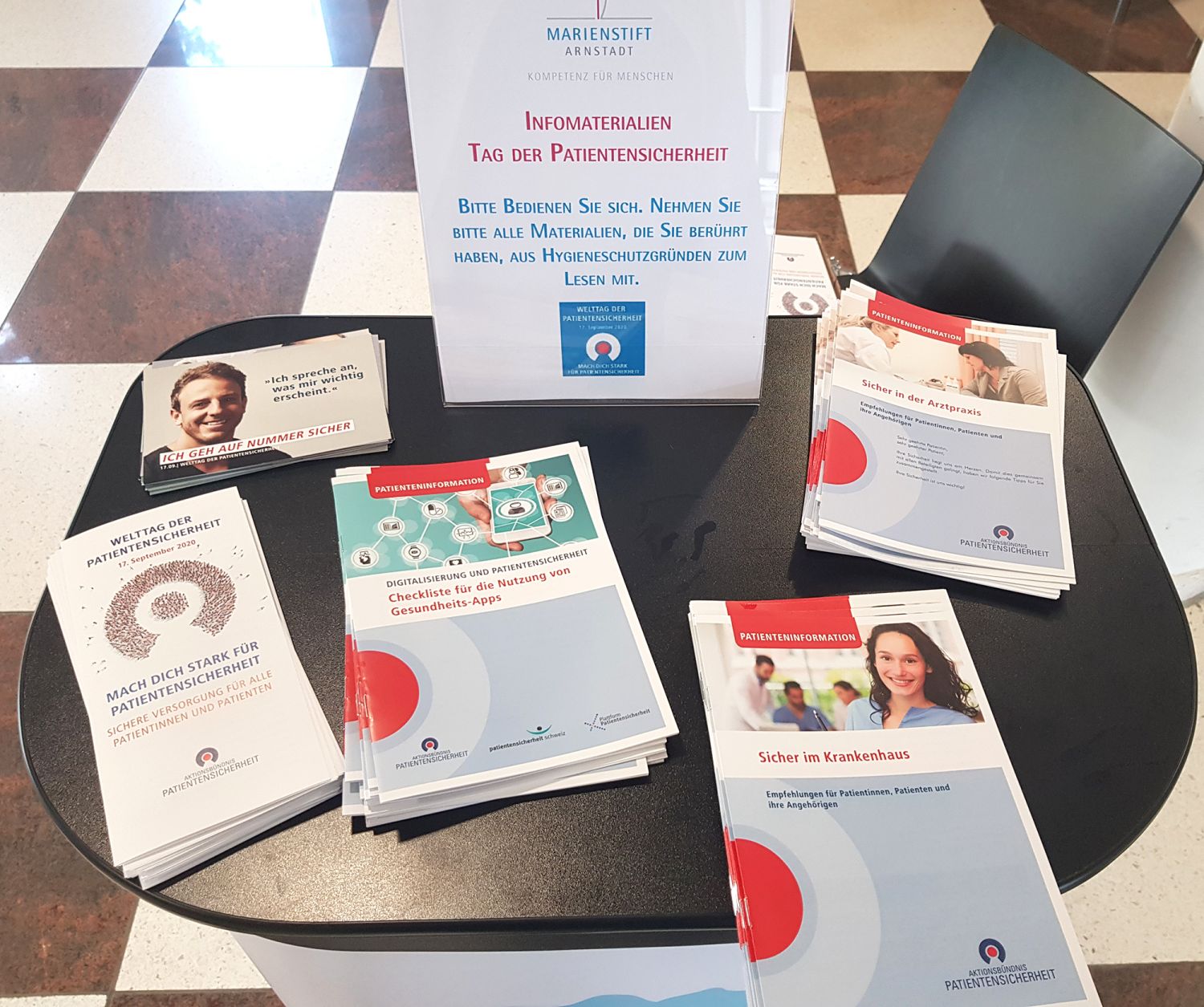 Weil in diesem Jahr der internationale Aktionstag unter dem Thema „Mitarbeitersicherheit“ steht, haben wir unsere Aktionen zweigeteilt: „Wir machen uns stark – für Sie!“ umfasst den Part Patientensicherheit mit Infostand und Material rund um die Themen Arzneimittelsicherheit, Umgang mit Gesundheits-Apps, Ratgeber für Arztbesuch und Klinikaufenthalt etc.
