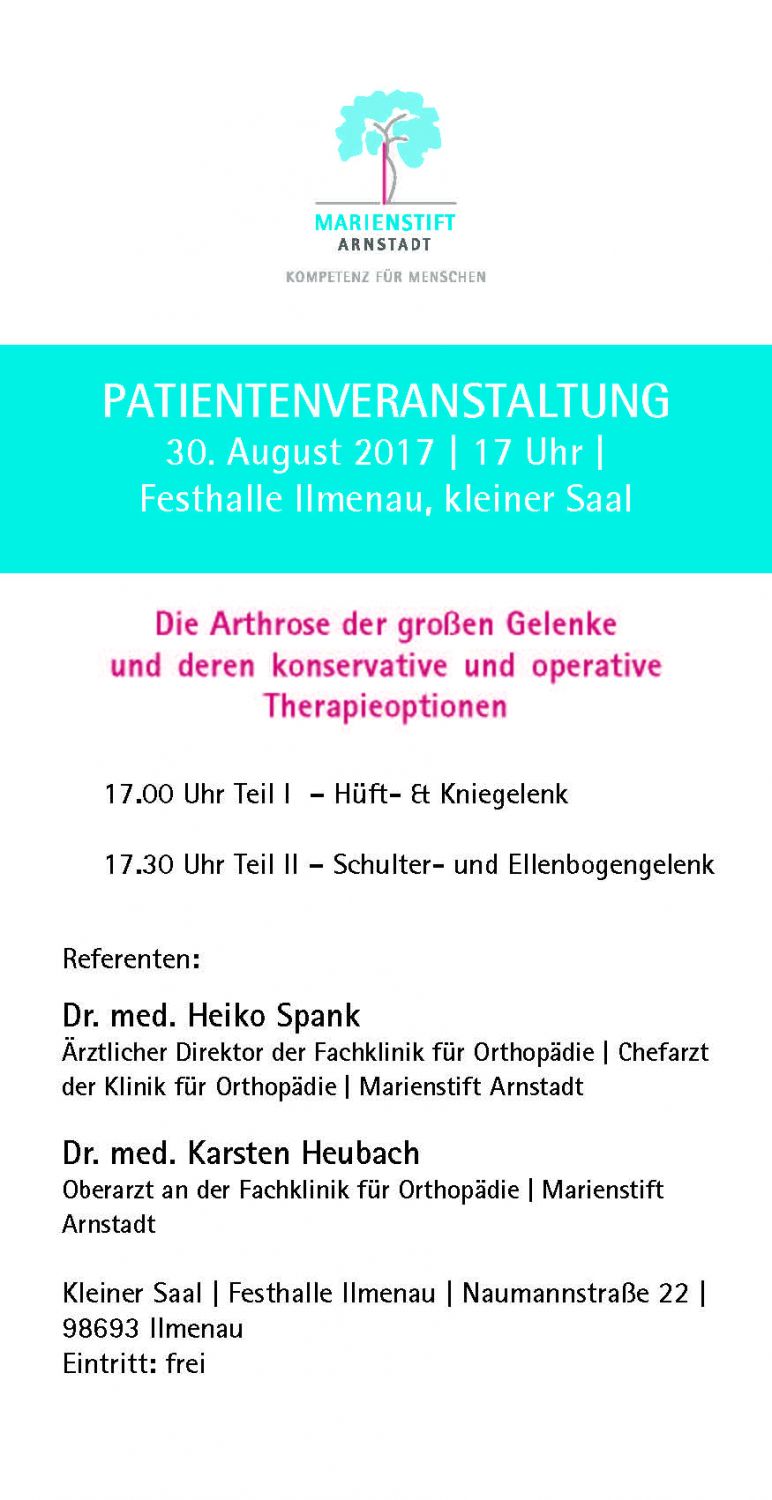 Arthrose der großen Gelenke - konservative und operative Therapieoptionen: Die Fachklinik für Orthopädie lädt Interessierte zum Vortrag in die Festhalle Ilmenau ein. Chefarzt Dr. med. Heiko Spank widmet sich in seinem Vortrag der Arthrose an Knie- und Hüftgelenk, Oberarzt Dr. med. Karsten Heubach beleuchtet die Arthrose an Schulter- und Ellenbogengelenk.