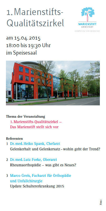 den Auftakt unserer Fortbildungsreihe Qualitätssicherung Orthopädie im Marienstift Arnstadt möchten wir nutzen, um Sie umfassend in der Klinik für Orthopädie über unser Leistungsspektrum in Kenntnis zu setzen. Wir werden Sie zu Themen auf dem Gebiet der gelenkerhaltenden und gelenkersetzenden Medizin, der Rheumaorthopädie sowie der Schulterorthopädie informieren.