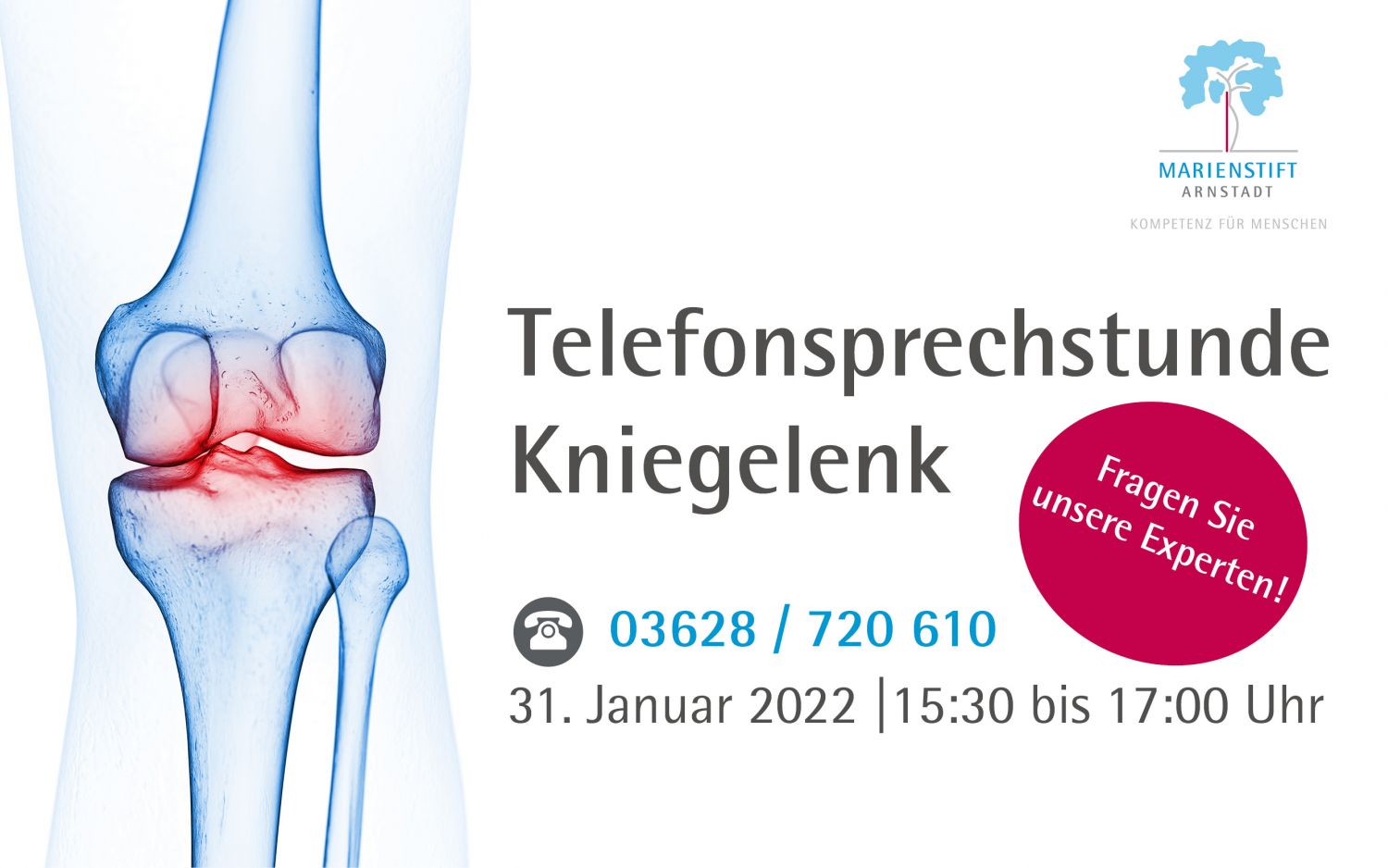 Als Ersatz für die Corona-bedingten Pausen in der Veranstaltungsreihe „Orthopädie im Gespräch“ bieten die Spezialisten der Fachklinik für Orthopädie des Marienstifts Arnstadt Telefonsprechstunden an. Am 31. Januar 2022 beantworten die Mediziner von 15:30 Uhr bis 17:00 Uhr unter der Telefon-Hotline 03628 / 720 610 die Fragen der Anrufer. Thema an diesem Tag ist das Kniegelenk.