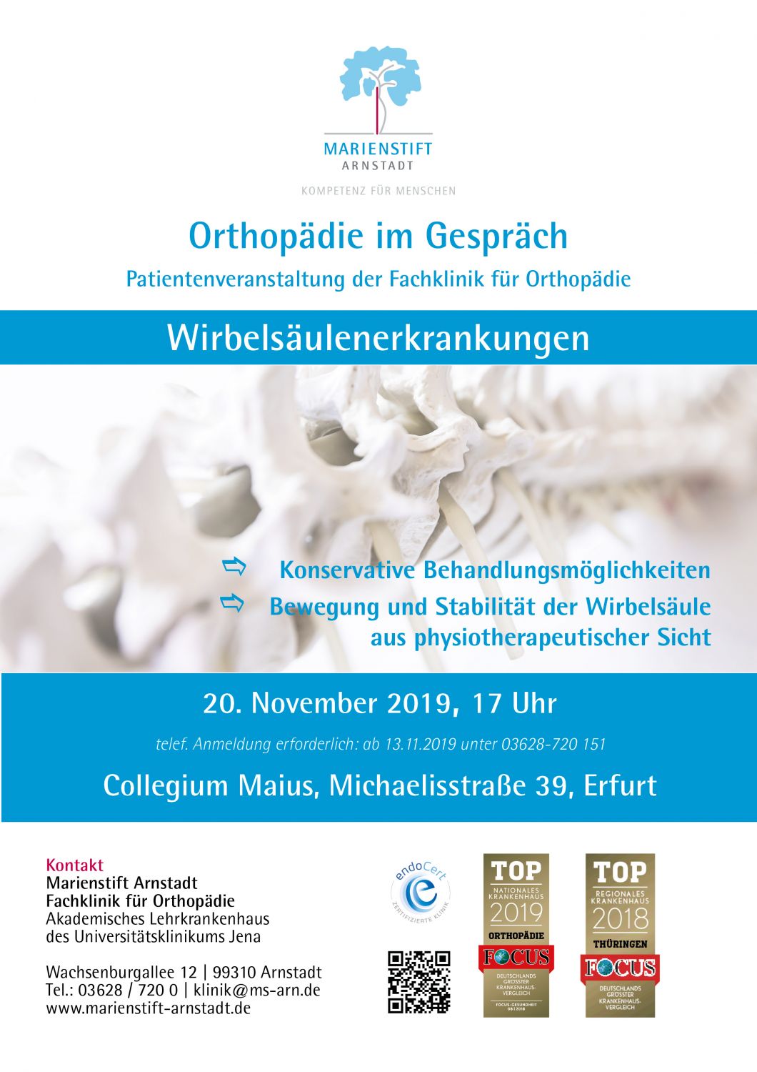 Wirbelsäulenerkrankungen – darum geht es in der für dieses Jahr letzten Patientenveranstaltung der Fachklinik für Orthopädie des Marienstifts Arnstadt am 20. November um 17 Uhr im Erfurter Collegium Maius (Alte Universität, Michaelisstraße 39).